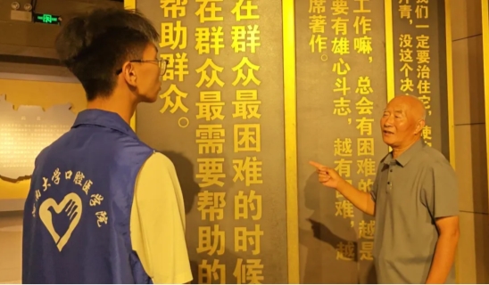 图为兰考县展览馆内,老党员正在热情地向实践团介绍焦书记名言背后的故事