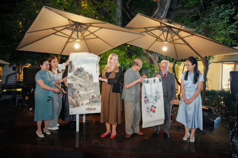 交流座谈后,中外宾客共同欣赏了一场极具东方韵味的文化雅集。活动以音乐人小冈的箫独奏《和谐》开场,千年箫韵婉转流淌,尽显东方文化的深邃与宁静。中国古琴文化促进会会长杜大鹏、中国东方乐团团长姜淼、青年艺术家韩佳霖带来的古琴、古筝、昆曲表演,将中国传统文化展现得淋漓尽致。魔术师李阳进行了精彩的魔术表演,为现场增添了轻松与欢乐。最后古琴、古筝与箫的即兴合奏,更让嘉宾沉浸于中华文化的独特魅力。石景山区美协主席孙开桐挥毫泼墨并将书画交由石景山区文联主席董聪慧赠给奥方代表。