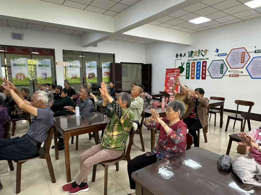 在集体活动区域,志愿者与老人一同参与康养互动。伴随舒缓节奏,大家抬手、伸展,进行简单康养操练习。志愿者耐心指导动作,关注老人身体状态,康养操不仅锻炼肢体,更让老人在集体参与中收获愉悦。活动墙上 “老年人健康饮食” 等科普内容,也成为现场教学素材,助力老人提升健康认知。