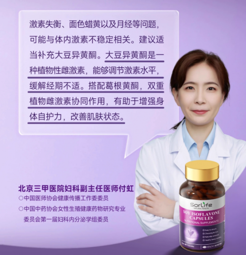 “大豆异黄酮是一种植物性雌激素,能够调节激素水平缓解经期不适。搭配葛根黄酮,双重植物雌激素协同作用,有助于增强身体自护力,改善肌肤状态。”