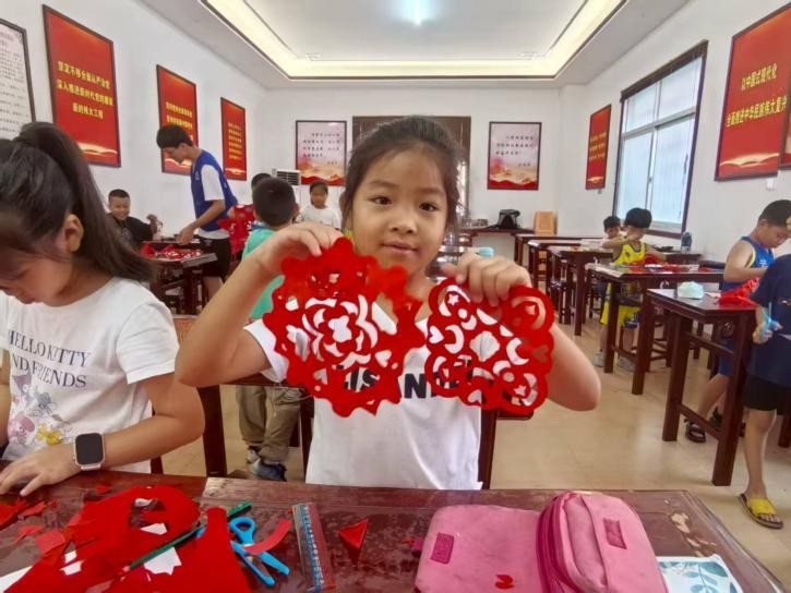 于7月15日和17日,实践队在海沧区锦里村接连开展两场《咔嚓!漳浦剪纸寻宝记》主题课程。课堂上,队员们以生动讲解揭开了闽南剪纸作为“文化活化石”的神秘面纱——月牙纹寓意团圆美满,柳叶纹象征生机盎然。伴随着清晰的折纸、构图与裁剪技法示范,孩子们兴致勃勃地拿起红纸与剪刀。在队员们的指导下,一张张融合传统纹样的窗花在童稚的手中绽放。尤为巧妙的是,课程创新融入了实践队前期茶文化教学的成果,专门设计了茶壶剪纸模板。孩子们细心描摹、精心剪裁,在掌握对折剪、掏剪等技法的同时,深刻体悟到传统工艺的严谨与生活美学的意趣。