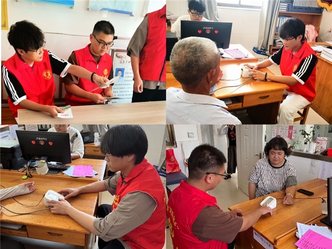 在村医务室,团队成员的身影同样忙碌。他们协助医务人员整理预防传染病手册,将各类宣传资料按病种分类、汇编成册,方便村民查阅学习;针对村里老年人口较多的特点,团队还主动参与血压测量服务,耐心为老人们讲解血压数值的意义,提醒他们注意日常饮食与作息,用细致的关怀守护村民的身体健康。
