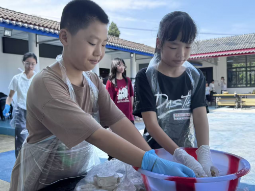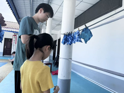 “老师,为什么用皮筋扎住和夹子夹住的地方还是白色的?”“染缸里的布拿出来为什么会变色呢?”操作过程中,孩子们的问题一个接一个地冒出来。这些源自亲身体验的好奇和追问,正是实践队最希望看到的。实践队队长表示:“看到孩子们从被动接受到主动发问,开始思考现象背后的原理,这正是文化启蒙和精神视野开拓的重要一步,也是我们设计这门课程的初衷。”