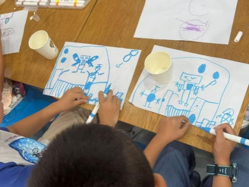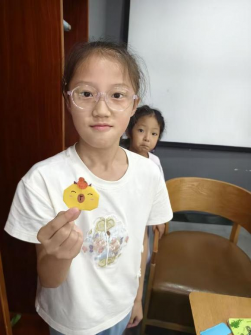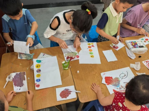 “红色画火焰,是生气的样子;蓝色像湖水,代表安静。”在色彩与情感主题课堂,孩子们用基础颜料勾勒表情包,在色彩混合实验中见证“红+黄=橙”的奇妙变化,更走进社区花园开展植物拓印——将叶片铺在布袋上轻拍颜料,让叶脉纹理与自然色彩跃然布面。志愿者引导孩子们发现每片叶子都有独特纹路,在触摸自然、创造美的过程中,悄然播下审美感知的种子。