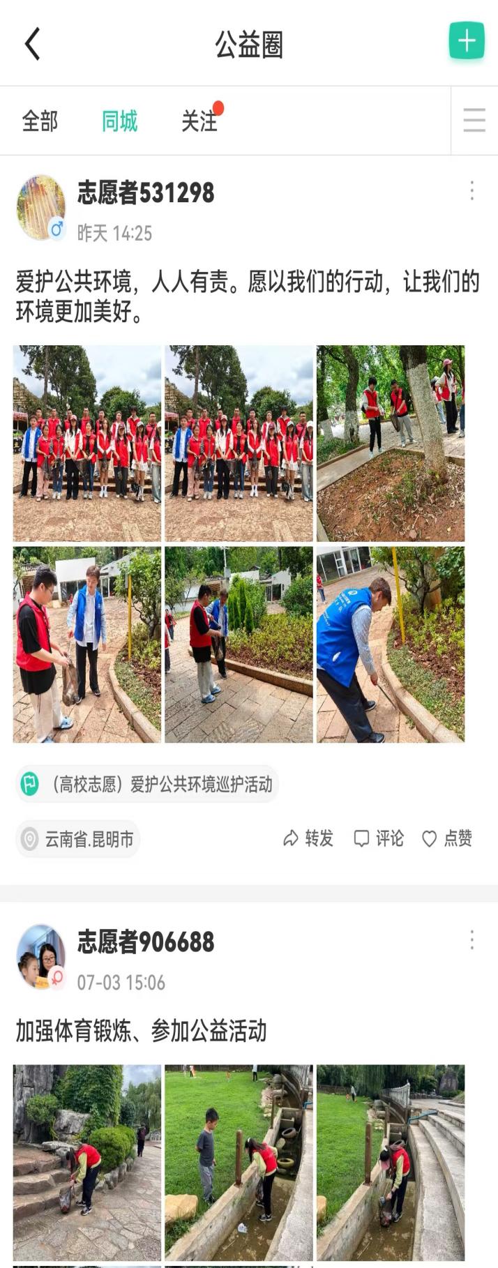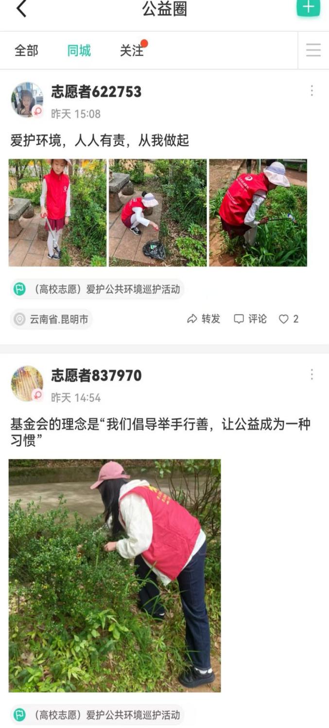 活动结束后,志愿者们将此次行动的照片上传至“志愿汇”APP公益圈——镜头里,有被清理干净的草坪小径,有装满垃圾的分类袋,还有志愿者们手持“垃圾不落地”标语牌的合影。
