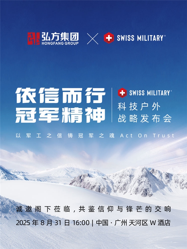 拥有141年军工传承的瑞士国民户外品牌SWISS MILITARY瑞士军工品牌,其中国首秀将于8月31日16:00在广州W酒店举行。本次SWISS MILITARY瑞士军工以 “依信而行,冠军精神” 为主题的科技户外战略发布,将首次展出品牌系列户外服新品,演绎“战术美学民用化”的户外新范式,同时官宣首位品牌推荐官。