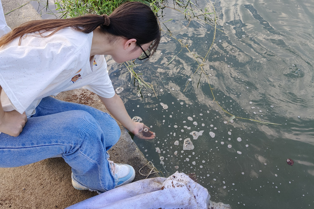 实践团队队员高佳慧体验饲料投喂 岑永宣摄
