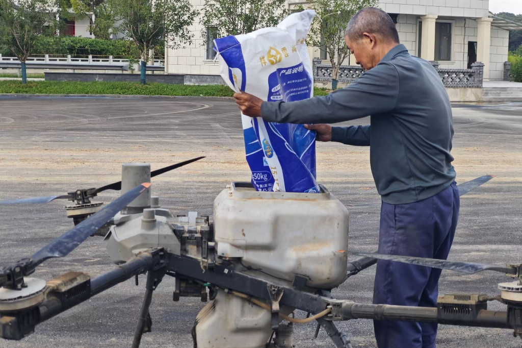 技术员向无人机储料箱中添加肥料 岑永宣摄
