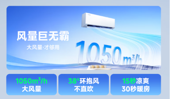 性能体验实现双重突破:APF值6.26,叠加AI智能省电模式,最高省45%电量,实现“大风量不费电”。风量达1050m³/h,配合15米远距离送风,2.56分钟完成全屋空气循环,避免冷热不均;控温细节更显人性化:15秒速冷、30秒速热,开机即享舒适;6档风量+四向送风消除温差,防直吹功能避免冷风不适,底部制热解决冬季脚下凉痛点。