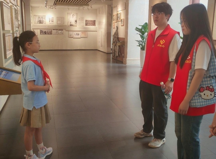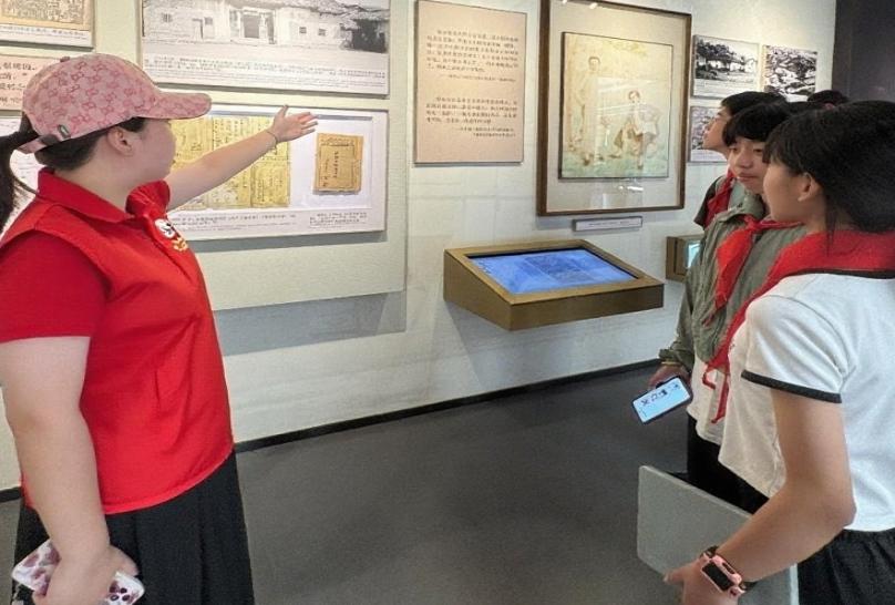红领巾讲解员向实践队成员介绍瞿秋白的生平。(张浩然 供图)