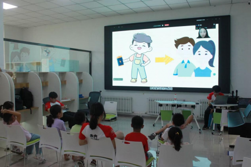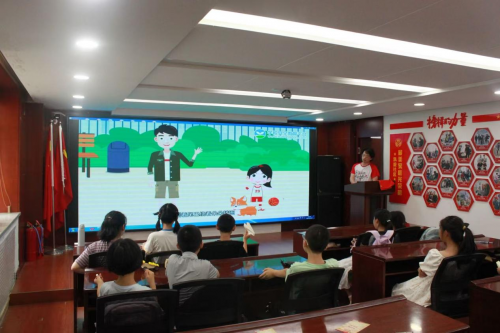 在沈河区凯旋社区,实践团成员站在讲台上,身后大屏播放着性教育卡通动画 ,用童趣生动的方式讲解生理结构。