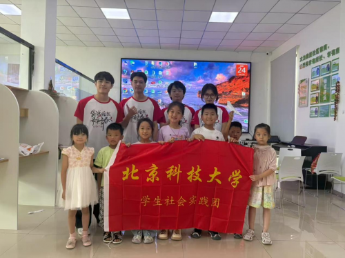 (图3:实践团成员和孩子们举着“北京科技大学学生社会实践团”旗帜,定格温暖瞬间)