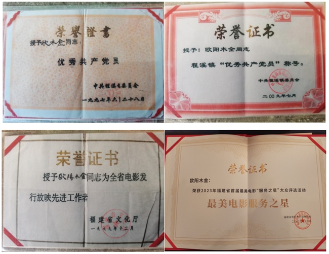 自1980年踏上电影放映之路以来,欧阳木金已在这条路上行走了46个春秋。从青丝到白发,从露天广场到校园礼堂,他始终带着放映设备穿梭于村镇之间,用光影点亮乡村文化生活。2013年,他参加福建省第二期公益电影放映培训班,不断提升专业水平,先后二次评为全省电影放映先进工作者和一次全国六部委联合表彰的先进单位,以及程溪镇党委授于二次优秀党员的光荣称号!成为传播的标杆人物。