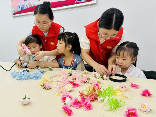 制作环节中,孩子们围坐在一起,在平安产险志愿者的指导下认真“创作”:有的小心翼翼地将粉色康乃馨、蓝色小雏菊插进花托,有的踮着脚尖挑选配饰,还有的学着大人的样子,轻轻调整花束角度。“我要把花摆得像小太阳,阿嬷看到一定会很开心!”4岁的昕昕一边固定花瓣,一边奶声奶气地说。虽然孩子们的手法略显笨拙,花瓣摆放也不那么规整,但每一支簪花里都藏着童真与用心。