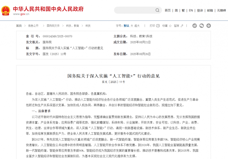 国务院近期印发的《关于深入实施“人工智能+”行动的意见》,将“人工智能+”治理能力列为重点发展方向,明确提出应推动人工智能在政务服务和公共安全等领域的深度融合,进一步提升社会治理的智能化水平。