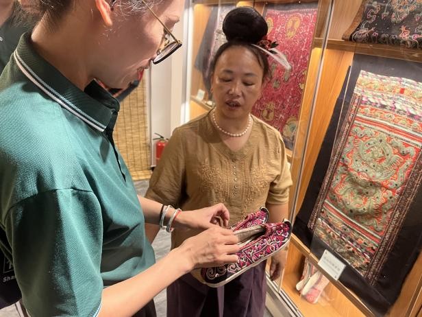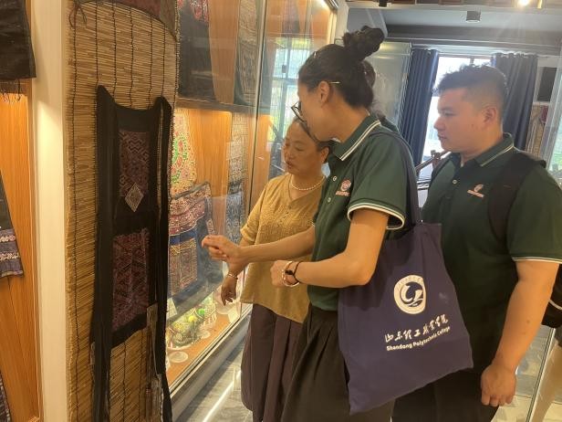 在兰英刺绣馆——这个民族刺绣文化的专题博物馆内,队员们惊叹于廖女士珍藏的各少数民族刺绣服饰。这些不仅是精美的艺术品,更是记录民族历史的文化瑰宝。实践团成员们用普通话认真记录、积极提问、深入交流,思考如何通过语言的力量,让这些珍贵文化遗产得到更好的保护、研究和传播。