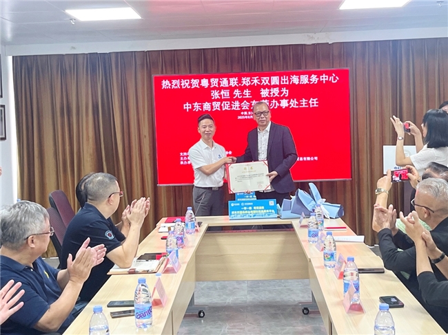 活力大湾区,广东再出发,继2025年7月1日成功开拓中亚市场并担任东莞市外贸企业协会哈萨克斯坦出海服务中心主任后,粤贸通联·郑禾双圆品牌出海服务中心负责人张恒先生再获重要任命,于8月22日在东莞市郑禾双圆出海全球服务中心正式就任中东商贸促进会东莞办事处主任。山东省政协常委、香港工业总会四组主席、香港家电协会吕伟会长,惠州市政协常委、香港领天国际有限公司叶启繁董事长,香港嘉瑞集团主席、香港创新科技及制造业联合总会李远发主席,环球连线有限公司董事长、中东商贸促进会仇伟崑会长,天下粮道(广东)健康科技有限公司何卫雄总经理,香港电镀业协会何冠寰会长,Artful公司董事长、中东商贸促进会吴桂明主席等各个机构或企业家代表分别送来了花篮及到场祝贺。