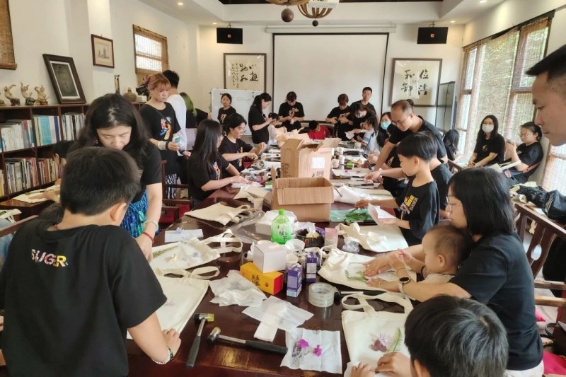 最后,在团队成员的指导下,青少年们亲自动手感受泉州非遗传统,用拓染艺术展现自己对本次活动的独特体验。团队成员化身文化传承的桥梁,亲自示范拓染的每一个步骤,从布料的选择、植物的搭配到拓印力度的掌控,都一一拆解。在制作文创产品的过程中,团队成员在旁巡回指导,及时纠正青少年们握锤的姿势、调整染料的配比。
