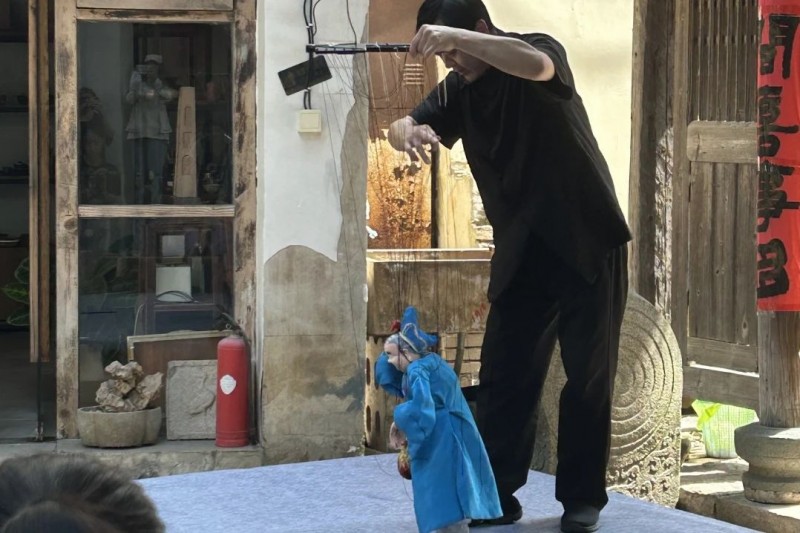 “小沙弥下山去咯——”舞台上,随着艺人指尖丝线的翻飞,憨态可掬的小沙弥眨着眼睛,迈着摇晃的步子“走”下台来,俏皮的闽南语配音惹得全场哄笑。