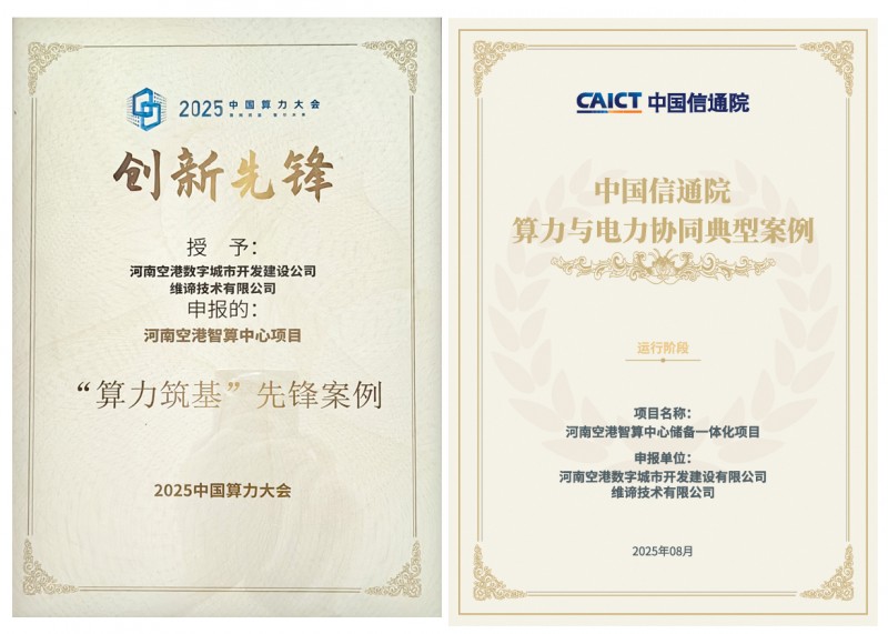 大会期间,主办方揭晓了备受业界瞩目的相关评选结果。河南空港数字城市开发建设有限公司与维谛技术(Vertiv)联合申报的“河南空港智算中心项目”,荣膺“创新先锋优秀成果奖”、“典型智算项目案例”两项殊荣。