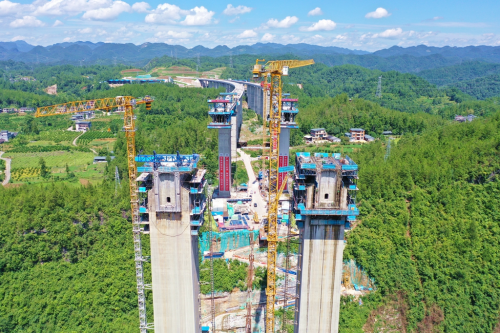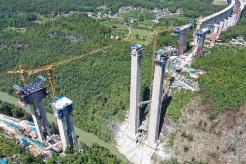 “大河特大桥为90+2×170+90预应力混凝土变高连续钢构箱梁大桥,桥长520米,桥面净宽11.5米,跨越峡谷的22至24号墩是大桥的上坡段,如向上昂起的龙头,挂篮施工是技术难点。”现场技术员刘杰介绍,大桥跨越大河“V”型深峡,一组数据可以说明大桥建设之难。位于峡谷底部的23号主墩设计墩高170米,为大直径深桩基础,桩基深度60米,承台为大体积混凝土承台,承台底距离山顶高度约110米,距大河水面约45米。2024年1月,项目部创新应用高落差减速溜槽运送混凝土技术,完成了23号主墩首根桩基浇筑,突破施工瓶颈,填补国内技术空白。目前,该桥22号主墩左幅完成6号悬浇节段施工,右幅正在施工8号节段;23号、24 号主墩9月初将全面启动挂篮悬浇施工。