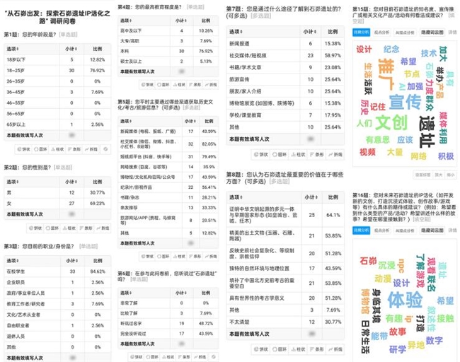 在项目初期,团队通过线上问卷展开调研与设计准备工作。调研结果显示,关注石峁遗址IP话题的受访者以18-25岁的年轻群体和在校学生为主,本科及以上学历占比较高,体现出年轻高知群体对石峁文化的兴趣。尽管石峁遗址作为中华文明起源的重要见证,公众认知度仍有较大提升空间——仅7.69%的受访者表示“比较了解”,超过四成表示“完全没听说过”。绝大多数受访者认可IP活化的重要性,并期待通过文创产品、沉浸式体验和数字内容等形式,增强石峁文化的传播力与公众参与感。这些反馈为团队后续的IP创意开发与传播策略指明了方向,提供了扎实的用户洞察。