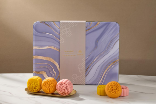 【远山黛】是一款优雅的紫色铁盒,盒子可再次利用,作为储物也是很好的选择,188元/盒,内含6粒60克冰皮月饼;3种不同口味:2粒流心奶黄月饼、2粒流心蔓越莓月饼、2粒流心榴莲月饼。