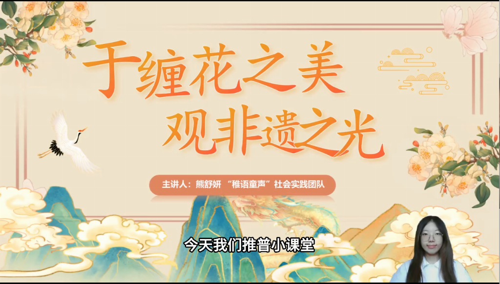 《于缠花之美,观非遗之光》专题课上,团队队长,汉语言文学23级本科生熊舒妍手持色彩艳丽的英山缠花出现在镜头中。作为团队推普首站湖北黄冈的特色非遗,英山缠花成为连接两地文化与语言的独特纽带。