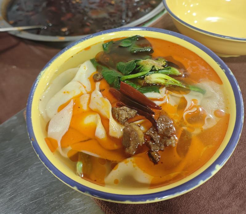 “汤要净、肉要烂、面要精”,太和板面讲究“一清二白三红四绿”:羊骨熬汤清澈见底,豆腐洁白如玉,辣椒红亮诱人,香菜蒜苗翠绿点缀。