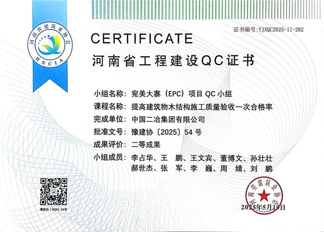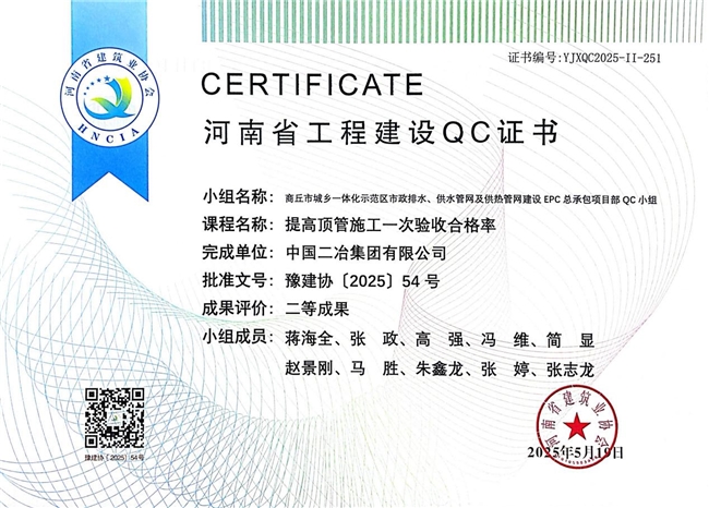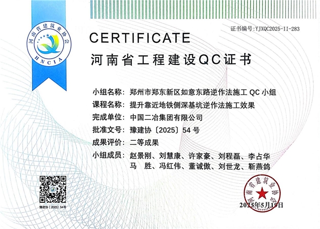 近日,省建协公布了2025年河南省工程建设质量管理小组活动成果评价(QC评价)结果,中国二冶集团中原分公司申报的《提高顶管施工一次验收合格率》《提升靠近地铁侧深基坑逆作法施工效果》《提高建筑物木结构施工质量验收一次合格率》荣获二等成果评价。