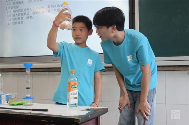 科学探索点燃好奇:化学实验课上引爆惊叹——当志愿者将不同溶液混合,瞬间产生“沸腾”效果,孩子们瞪大双眼,发出阵阵欢呼,争先恐后举手想要亲手尝试这“魔法”般的反应。