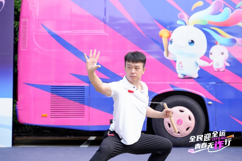 活动现场亮点纷呈,信息时报社打造的“一起‘趣’运动”全运主题巴士率先吸引目光——车身印着十五运吉祥物“喜洋洋”“乐融融”,车内设流动全运博物馆、文创快闪店及移动擂台互动区,成为师生“打卡热点”。随后,吕一杰以开场表演者身份登场,作为五连冠双节棍世界冠军、基尼斯世界纪录保持者、广州国际体育嘉年华传播大使,他凭借专业功底展现高水准双节棍技巧:棍影如风、动作酷飒,高难度招式配合节奏层层递进,每一次旋转与出击都引发师生欢呼,瞬间将现场氛围推至高峰,既契合“全民运动”氛围,更以趣味形式为反诈宣传聚足人气。