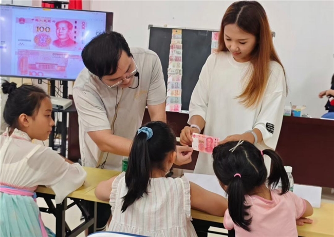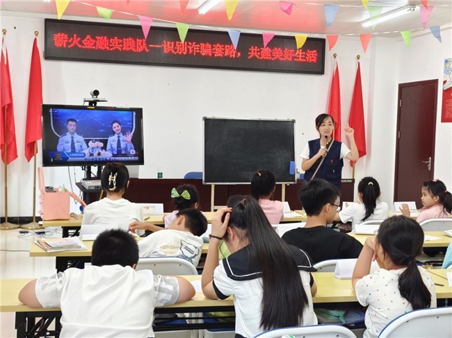 同时,反诈知识也走进了孩子们的财商小课堂,银行专业人士和实践队员结合生活中的真实案例,深入浅出地讲解货币的起源、储蓄的意义以及如何理性消费。特别聚焦识破“免费送皮肤”、“冒充亲友借钱”“AI诈骗”等常见、新型骗局,教会孩子们保护自己和家人的“钱袋子”,并现场演示了如何安全支付、保护个人信息等实用技能,进一步强化了孩子们的防范意识。
