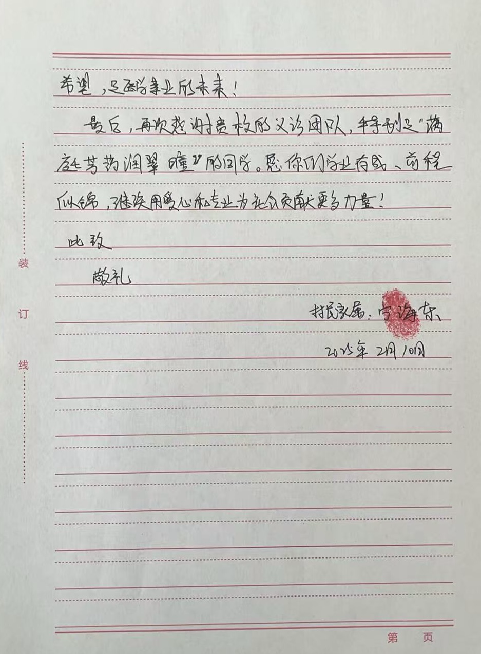 2025年2月,山东中医药大学“满庭芳药润翠瞳”志愿服务队队员刘馨娅在山东省泰安市开展寒假爱心义诊活动期间,不仅为当地村民提供了专业的健康服务,更以高度的责任感和敏锐的观察力,成功帮助一位老人识别出潜在的健康风险,为其后续治疗赢得了宝贵时间,以实际行动践行了医学生的誓言,传递了杏林春暖的温情。