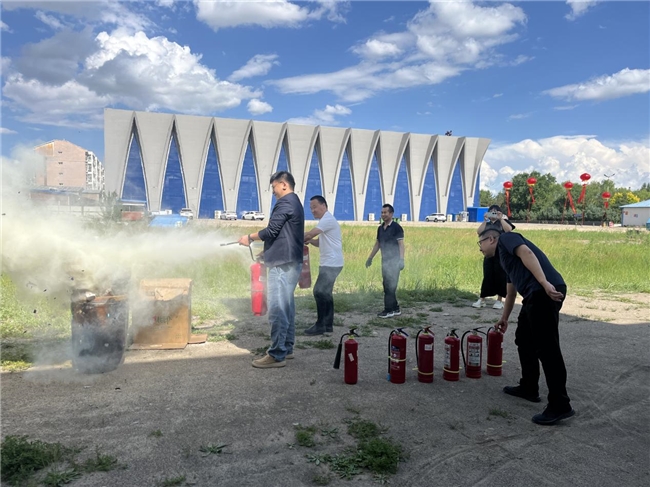 员迅速穿戴防护装备,赶赴模拟火点,熟练地使用手提式干粉灭火器对模拟着火点进行扑灭操作,演示了“提、拔、握、压”的标准使用步骤。