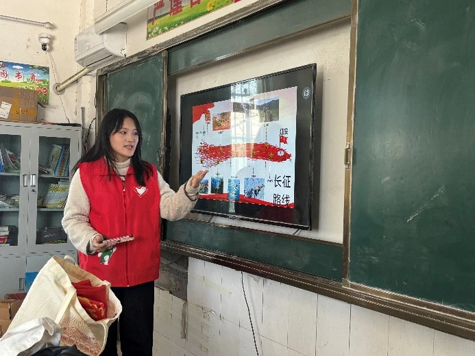 “红军不怕远征难,万水千山只等闲……”教室里响起铿锵有力的集体朗诵声。在宣讲团成员的带领下,学生们一句句跟读《七律·长征》。结合“飞夺泸定桥”等历史影像,成员们生动阐释了“金沙水拍云崖暖,大渡桥横铁索寒”背后的壮烈情节。有学生分享道:“这首诗让我明白了红军战士的勇敢和乐观,面对困难永不放弃——这就是我要学习的精神。”