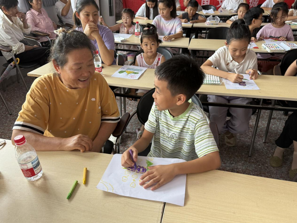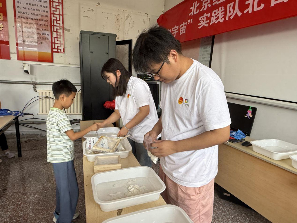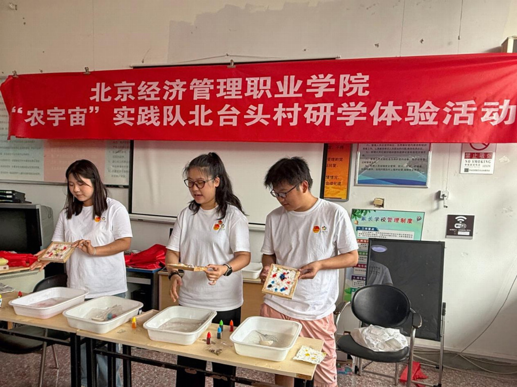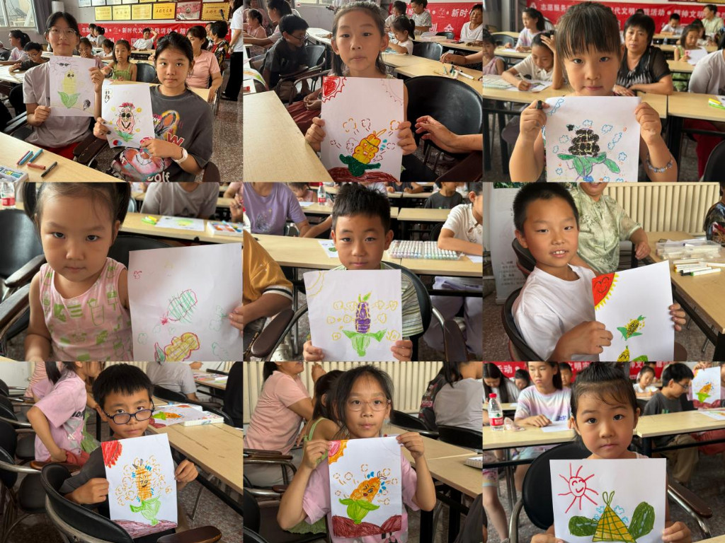 实践队为村内19名儿童组织暑期研学活动。活动中,孩子们发挥观察与想象,在实践队的指导下创作了个性化玉米主题画作。实践队成员们引导孩子们体验玉米皮造纸工艺:学习将废弃玉米叶制成的纸浆均匀铺于滤网、压实,最终转化为手工纸张。通过绘画与造纸实践,孩子们近距离感受了“棒台头”鲜食玉米的文化价值,体验了资源再利用过程,提升了动手能力与环保意识。
