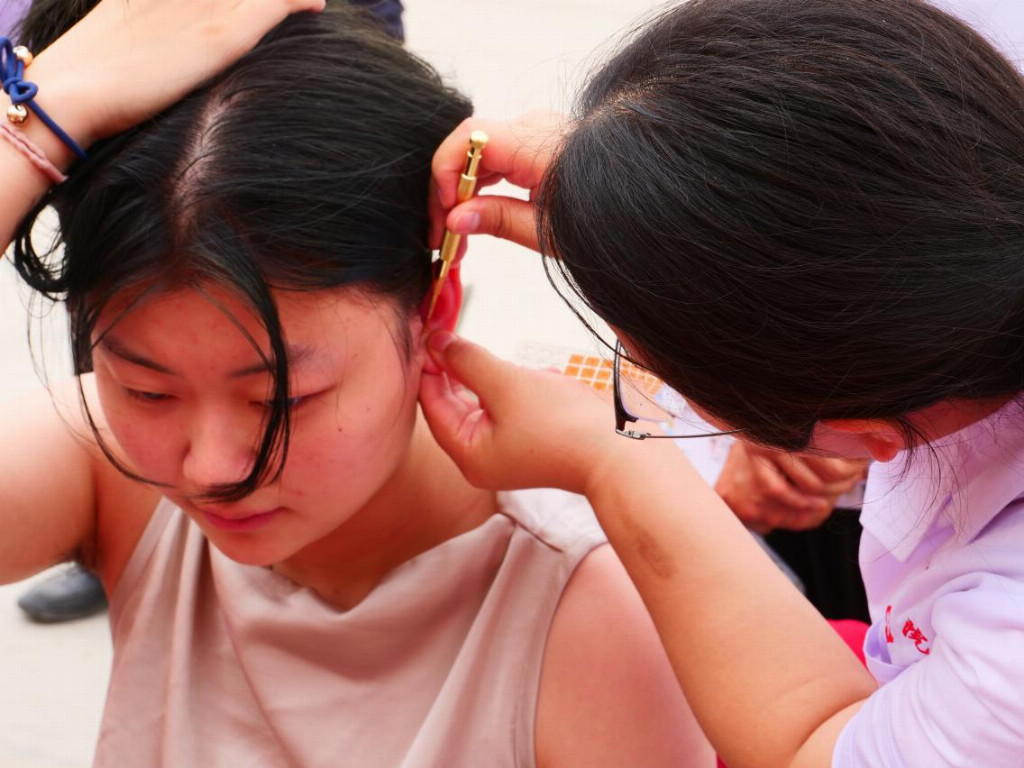 (图为耳穴压豆技术,高培珍老师正帮助调理脾胃功能 李成志供图)