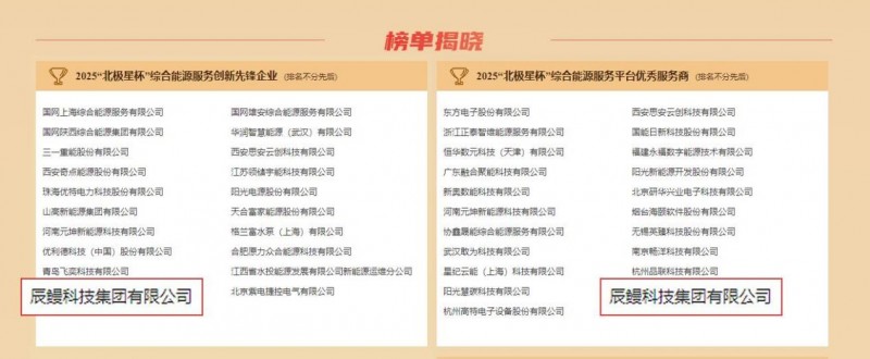 近日,辰鳗科技集团凭借在综合能源服务领域的创新成果,斩获2025年度“北极星杯”综合能源服务平台优秀服务商、综合能源服务创新先锋企业两项荣誉称号。