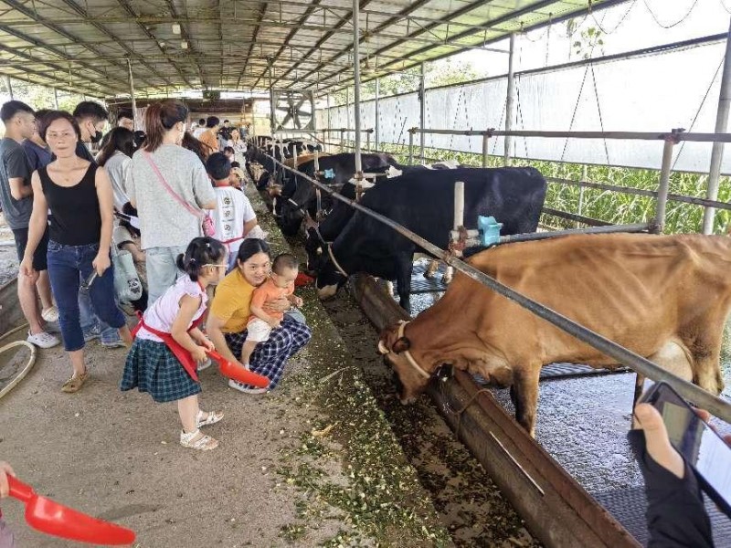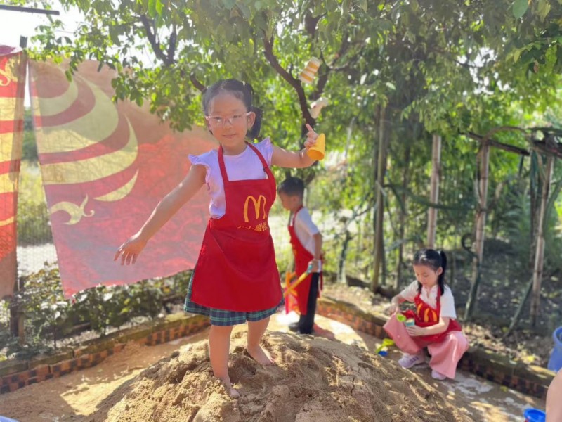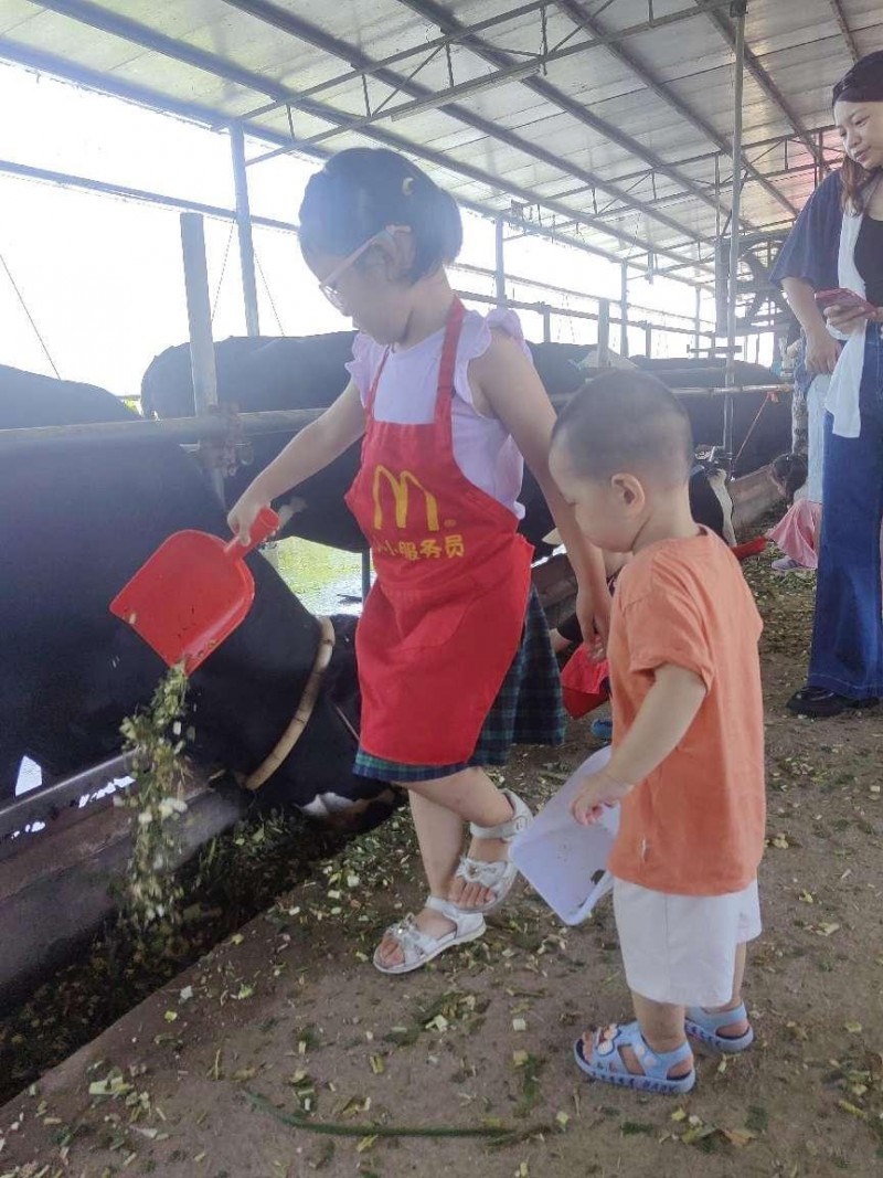 活动现场,孩子们穿着印有麦当劳标志的红色小围裙,化身“小小服务员”。在沙堆区域,他们尽情玩耍,用小工具构建着属于自己的“沙之城堡”,阳光透过树叶洒下,映照出他们专注又快乐的脸庞。而在养殖场内,孩子们近距离接触奶牛,小心翼翼地用小铲子给奶牛投喂草料,眼神里满是好奇与欣喜。身旁的家长们或是温柔指导,或是用镜头记录下孩子与动物互动的温馨瞬间,亲子间的亲密氛围十分浓厚。