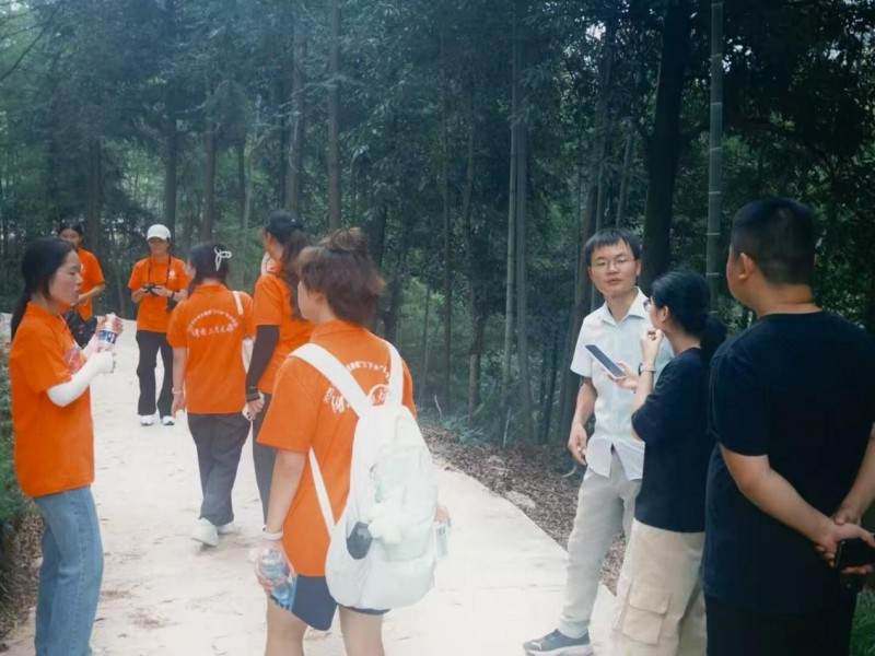 理论研讨后,在镇农业综合服务中心汪主任的带领下,团队走进笋竹菌培育示范基地。现场观摩了“以竹养菌、以菌促竹”的立体循环系统:竹屑转化为菌棒基质,菌类代谢物反哺竹林生长。此外主任向我们详细讲解春笋采挖“见白即收”、冬笋定位“观梢寻鞭”的传统智慧。团队成员穿梭于葱郁竹海间,亲手触摸竹节纹理,亲耳聆听关于竹林维护、菌种培育与四季收获的生动讲解。这场沉浸式的山林课堂,让书本上的生态循环理论在湿润的泥土气息与竹叶沙响中变得鲜活可感。