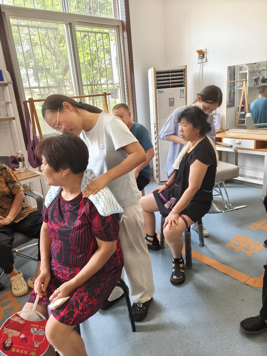 推拿服务点前很快排起了小队。长期伏案工作的张先生常感肩颈僵硬,队员运用所学的推拿技法,手指精准地按压在穴位上,配合揉捏、拿法,力道恰到好处。队员们不只是用手法缓解不适,更抓住机会进行"现场教学"。"叔叔,您这主要是长期姿势不良引起的,平时用电脑记得每隔一小时活动下脖子,像这样…"队员边操作边讲解病因和日常保养要点,这种"手把手"的"辨证施治",让居民们不仅缓解了当下的酸痛,更收获了预防复发的知识。