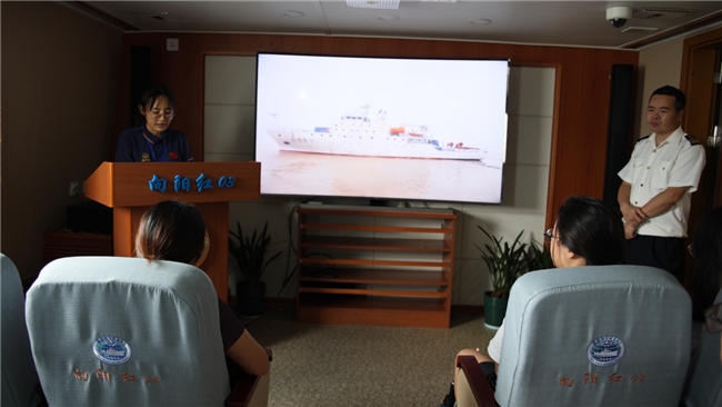 2025 年 7 月 21 日 青岛・“科学三号” 科考船驾驶室 郭小靓老师围绕“海洋强国、向海图强”,结合海洋科研历程传递报国信念 王治强供图