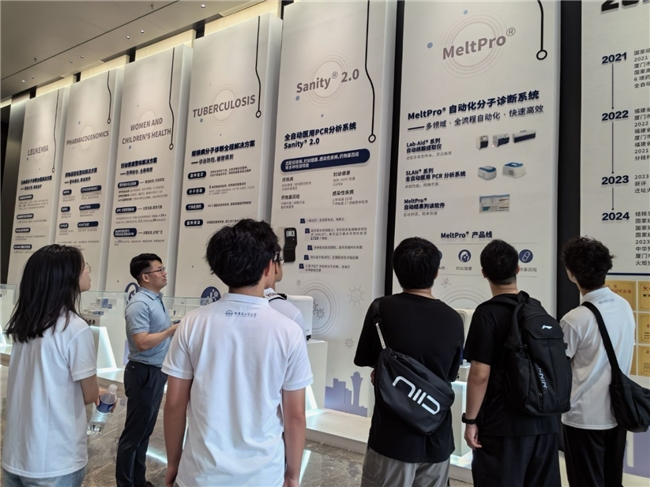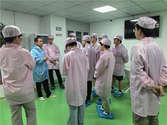 实践队队员在致善生物科技股份有限公司,企业校友占伟为队员们讲解核心产品矩阵的照片。