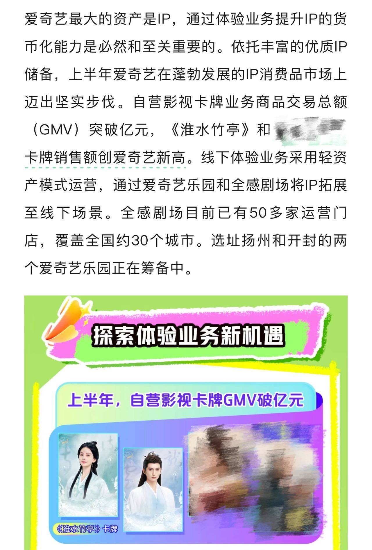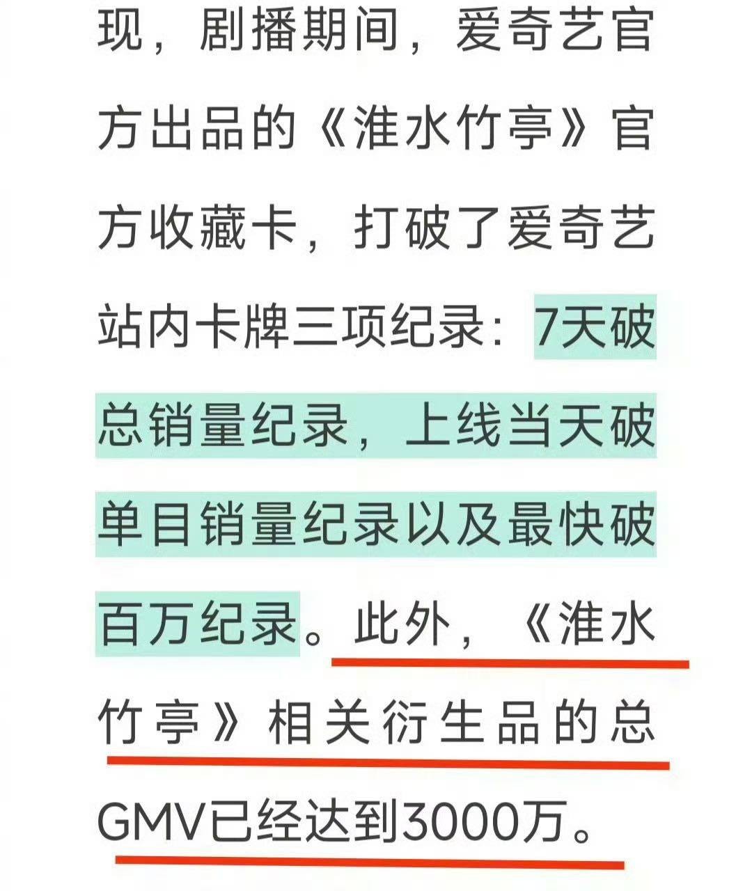《淮水竹亭》自开播起,便展现出强劲的市场爆发力。在剧播期间,全集都有广告投放,足见其商业吸引力。剧集的周边卡牌销售惊人,打破爱奇艺站内卡牌三项纪录,7天破总销量纪录,上线当天破单目销量纪录且最快破百万纪录,相关衍生品总GMV达3000万,自营影视卡牌业务GMV更是突破亿元,喜人的成绩直接登上了爱奇艺Q2财报。