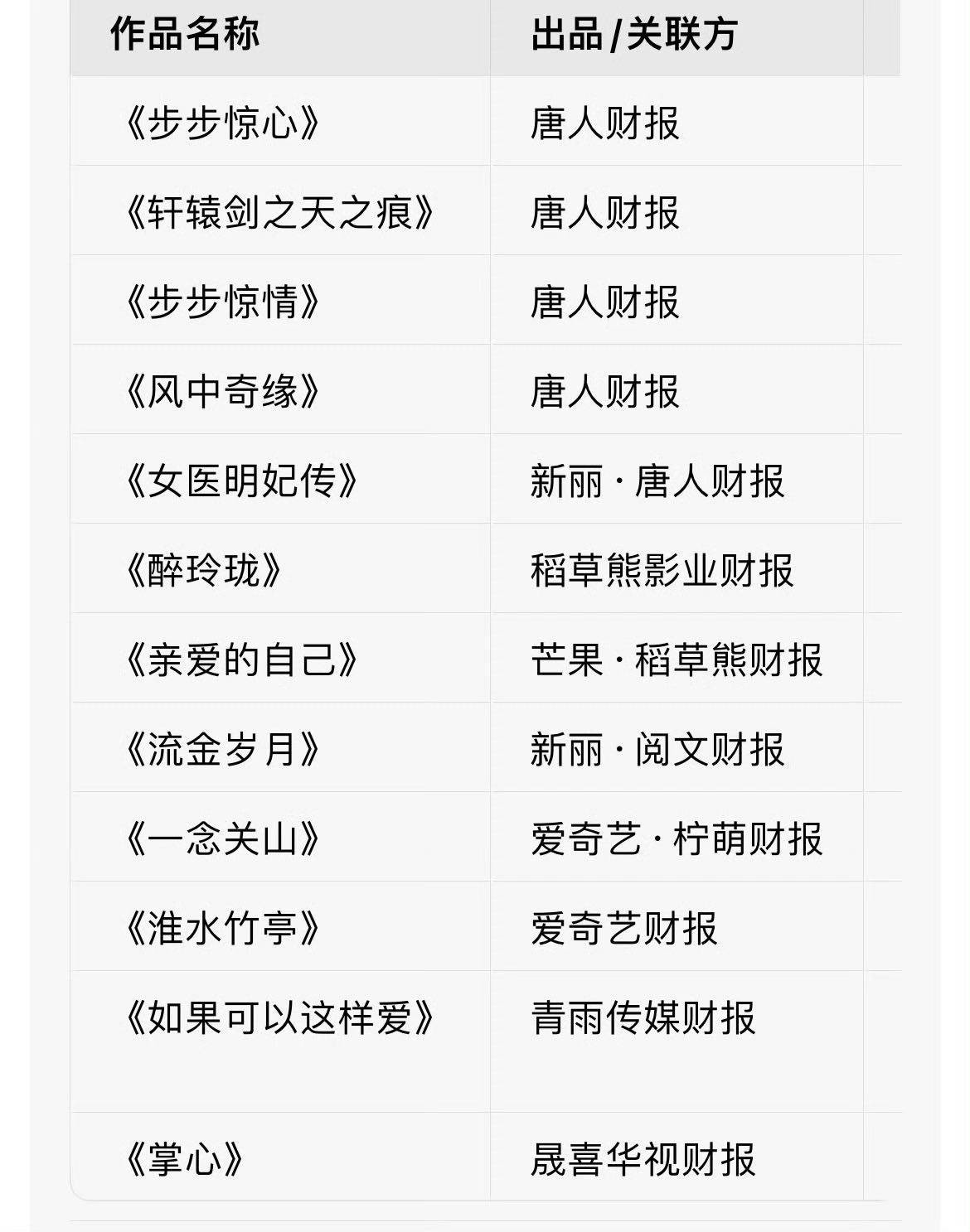 从早年的《步步惊心》《轩辕剑之天之痕》《步步惊情》《风中奇缘》登上唐人财报;到《女医明妃传》同时出现在新丽和唐人财报;再到《醉玲珑》位列稻草熊影业财报,《亲爱的自己》出现在芒果和稻草熊财报。