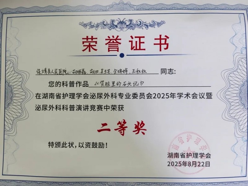 近日,湖南省医学会泌尿外科学专业委员会2025年学术年会在长沙召开。本次年会以“规范、创新、发展”为主题,通过“主会场引领+多分会场深耕”的立体化架构,系统覆盖了学科前沿、技术创新、基层医疗能力提升等多个领域。保靖县人民医院在全省护理学会泌尿外科专业委员会2025年学术会议暨泌尿外科科普演讲竞赛中,其健康科普作品《肾脏里的石头记》荣获全省竞赛二等奖。