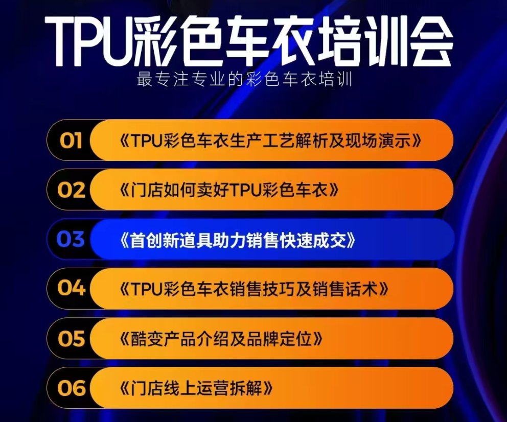 为解决门店销售无力的痛点,《门店如何卖好TPU彩色车衣》、《销售技巧及话术》立足终端实战的方法论。并同步创新性推出《首创新道具助力销售快速成交》工具化解决方案,让终端销量更加轻松。