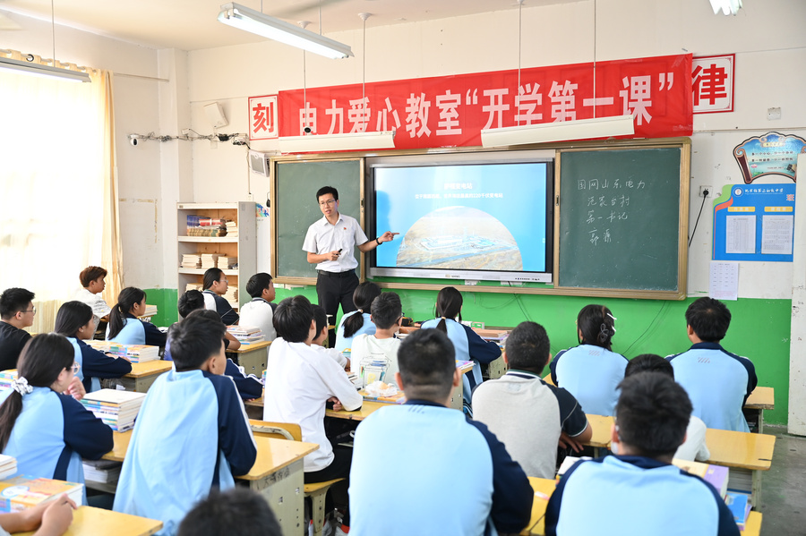 9月2日,国网山东电力省派第一书记郭源和国网平邑县供电公司彩虹共产党员服务队队员们来到平邑县地方镇第二中学,到“电力爱心教室”开展安全用电公益课堂“开学第一课”活动。