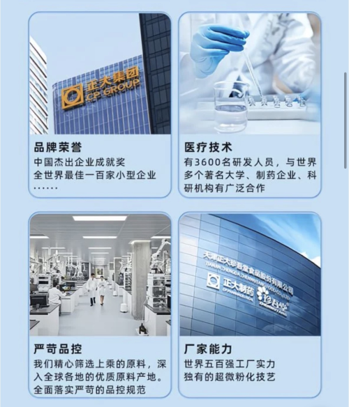 公司拥有优秀的医学营养专家和食品制造专业技术人才,并与中国医学科学院药物研究所、天津科技大学、天津中医药大学等专业机构建立产学研合作。经天津滨海新区批准,正大珍吾堂公司成立了"功能食品研发中心"。